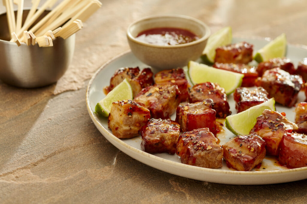 - Ychwanegwch y ciwbiau porc i’r bag a chymysgu’n dda, gadewch iddynt farinadu am o leiaf 6 awr, dros nos os yn bosibl.